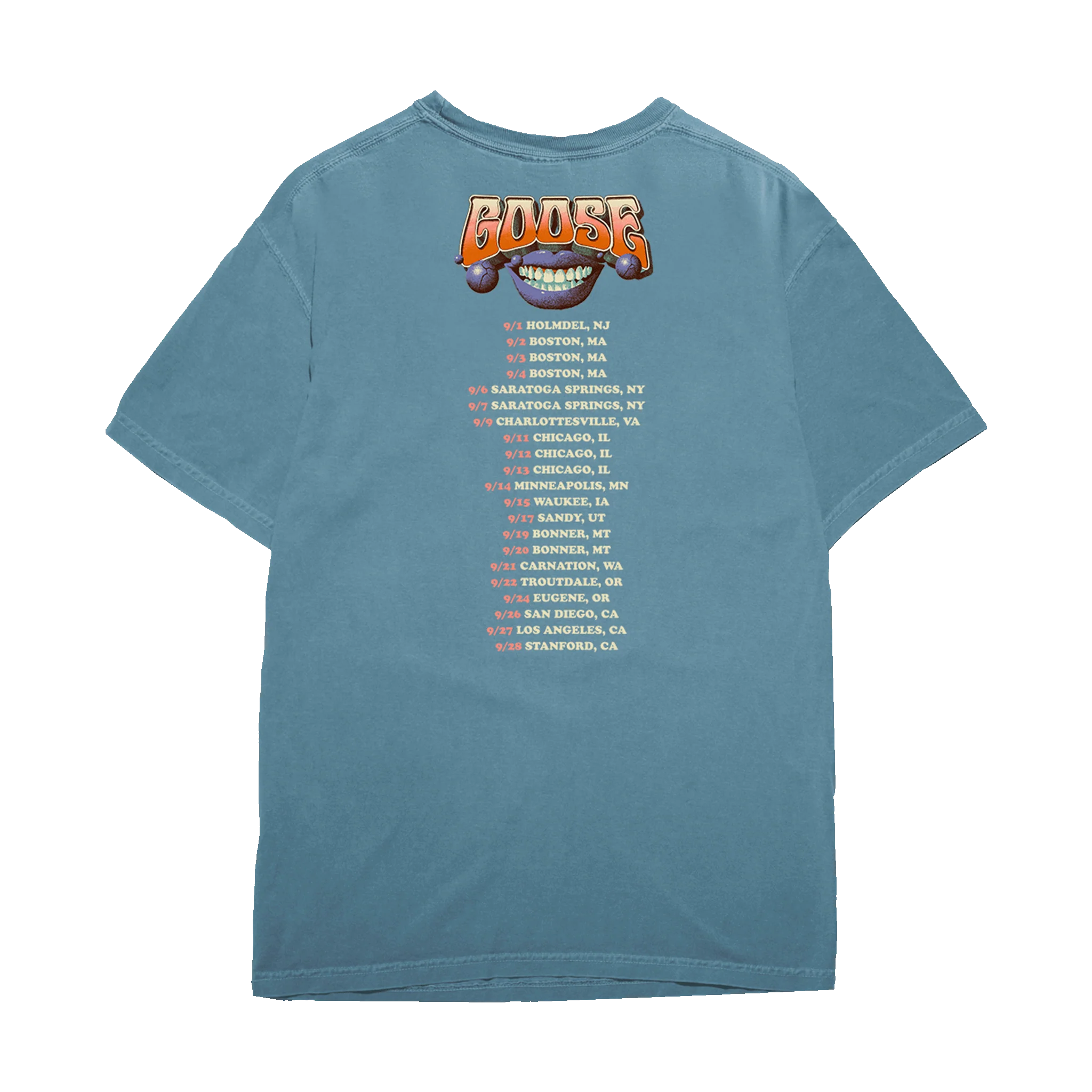 "Flowermouth" design printed on a 100% cotton blue tee. Art by Max Loeffler, includes Sept 2024 tour dates on the back