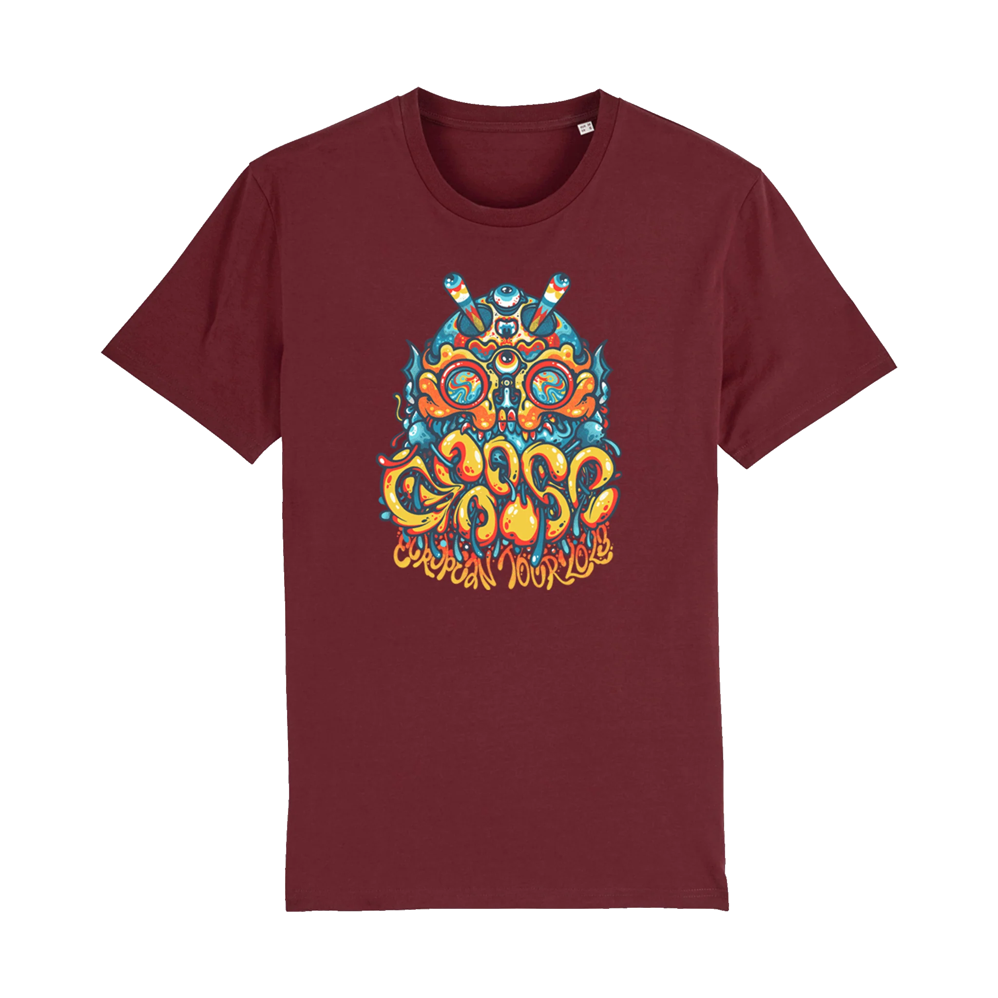 European Tour 2023 design by Drew Millward, printed on the front and back of a 100% cotton brick red, heavyweight garment-washed t-shirt.