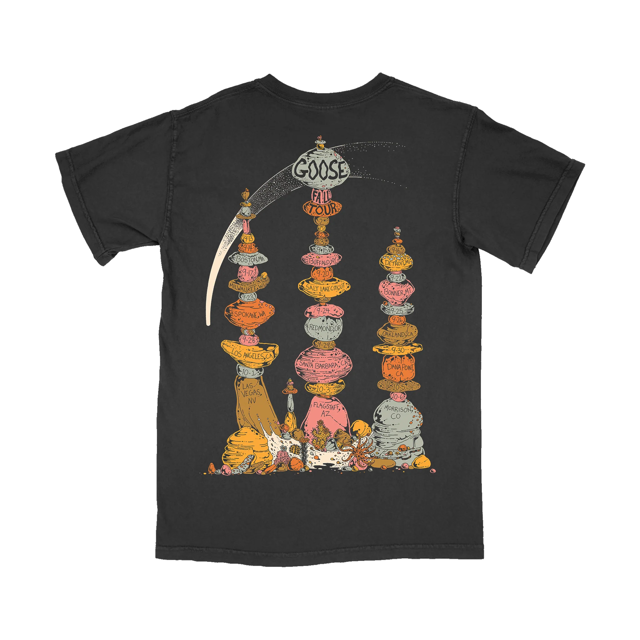 "Rock Formation" design by Brian Blomerth, screen printed on the front and back of a 100% cotton garment-washed black t-shirt.