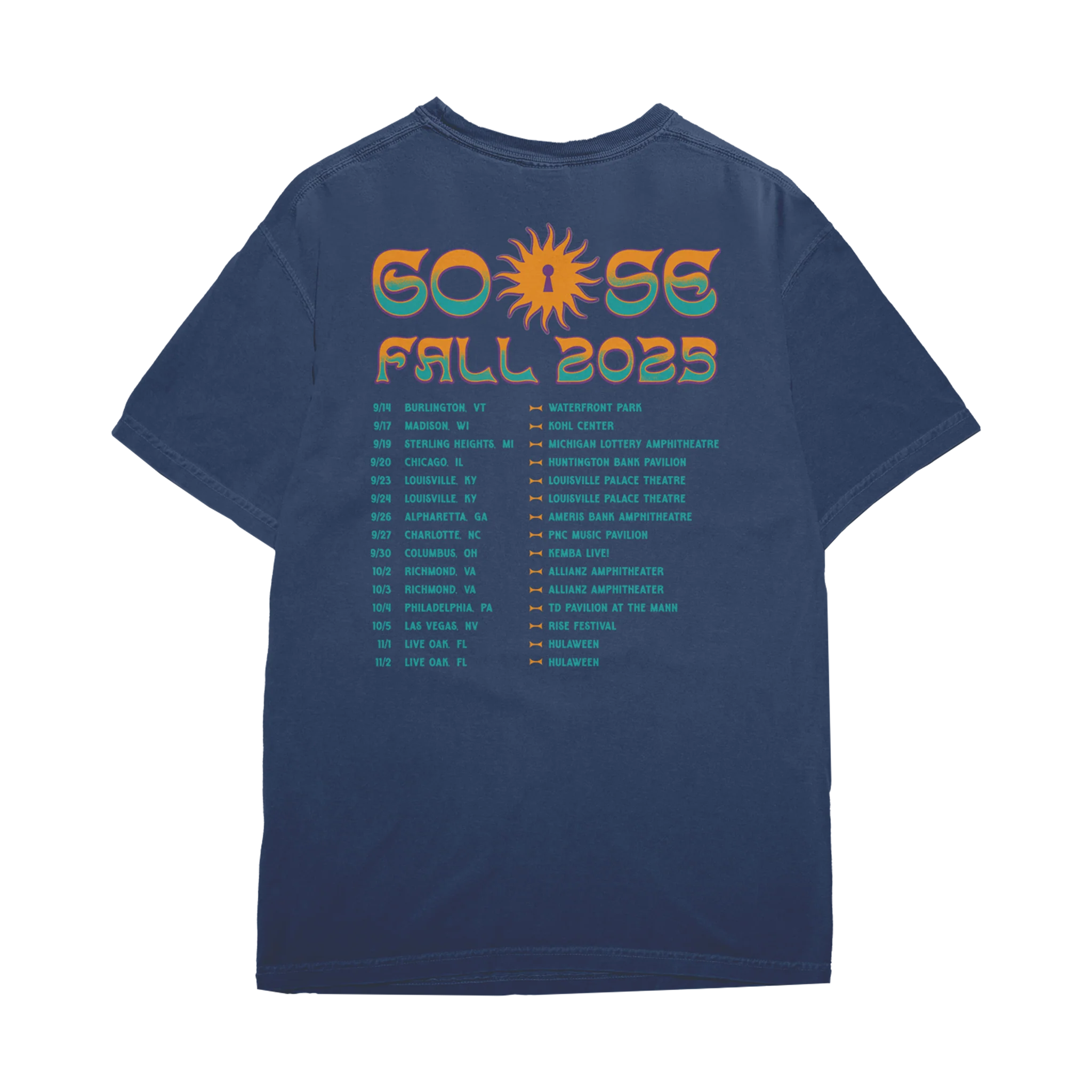 "Turbulence" design printed on the front with fall 2025 tour dates printed on the back of a navy colored 100% cotton t-shirt.